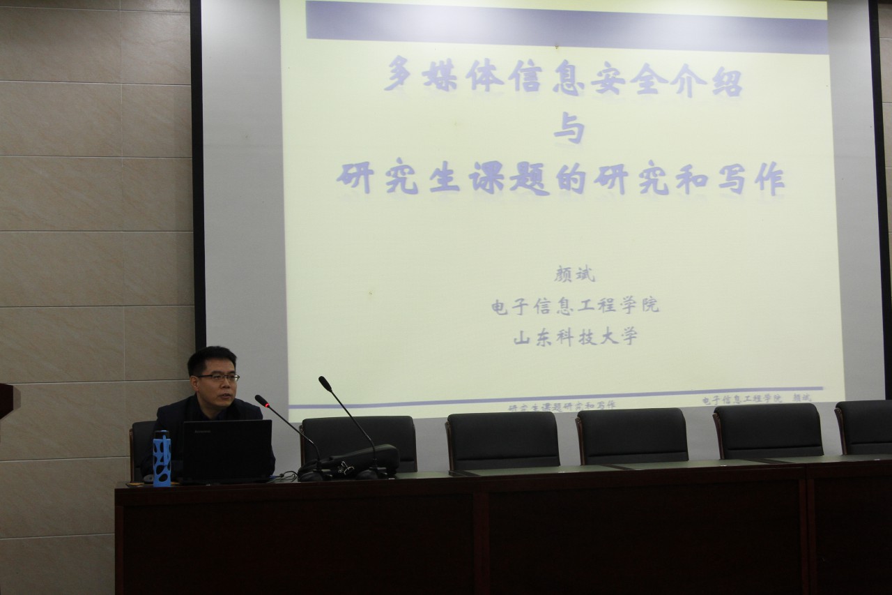 颜斌教授首先结合自身的学习工作经历简要介绍了课题组的研究方向,主要为多媒体信息安全和财务舞弊取证。该报告从数字水印、数字水印如何嵌入以及提取、如何保护版权和数字水印典型应用这几方面重点介绍了数字水印技术。随后讲述了通信安全以及私密分享问题,使同学们对多媒体信息安全有了一个更清楚深刻的了解。最后针对研究生课题的研究以及论文的阅读和写作做了一定的分析探讨并为大家提出了有效的建议。