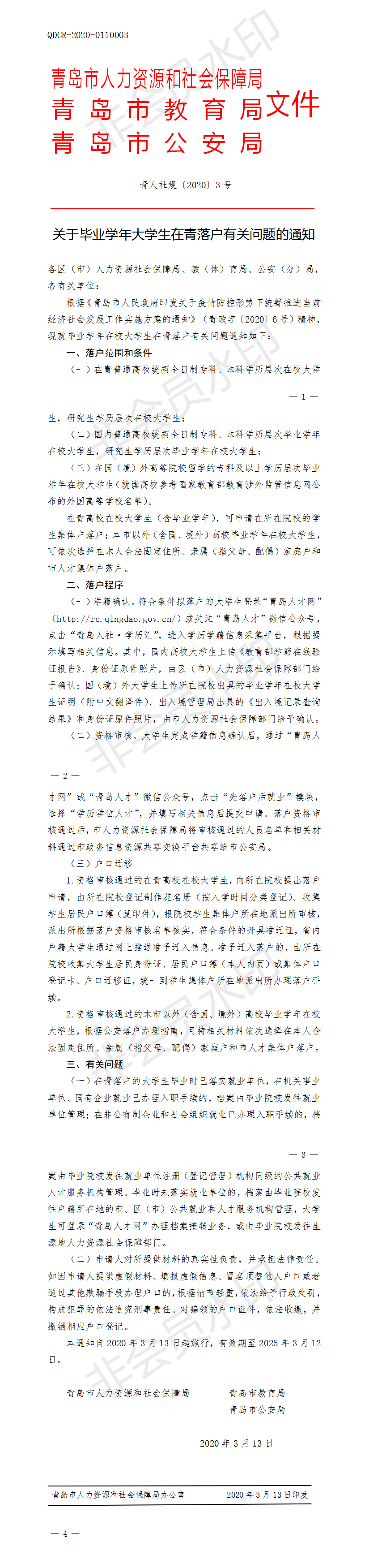 《关于毕业学年老员工在青落户有关问题的通知》(青人社规〔2020〕3号)